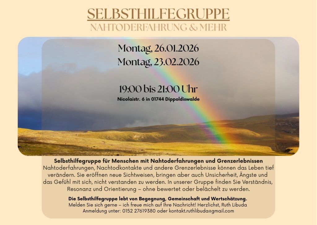 Nahtoderfahrungen, Nachtodkontakte und andere Grenzerlebnisse können das Leben tief verändern. Sie eröffnen neue Sichtweisen, bringen aber auch Unsicherheit, Ängste und das Gefühl mit sich, nicht verstanden zu werden. In unserer Gruppe finden Sie Verständnis, Resonanz und Orientierung – ohne bewertet oder belächelt zu werden.