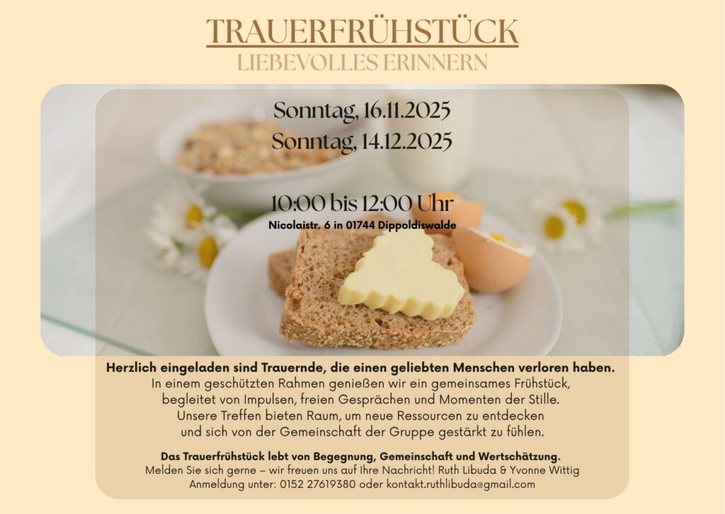 Das Trauerfrühstück lebt von Begegnung, Gemeinschaft und Wertschätzung. Melden Sie sich gerne – wir freuen uns auf Ihre Nachricht!