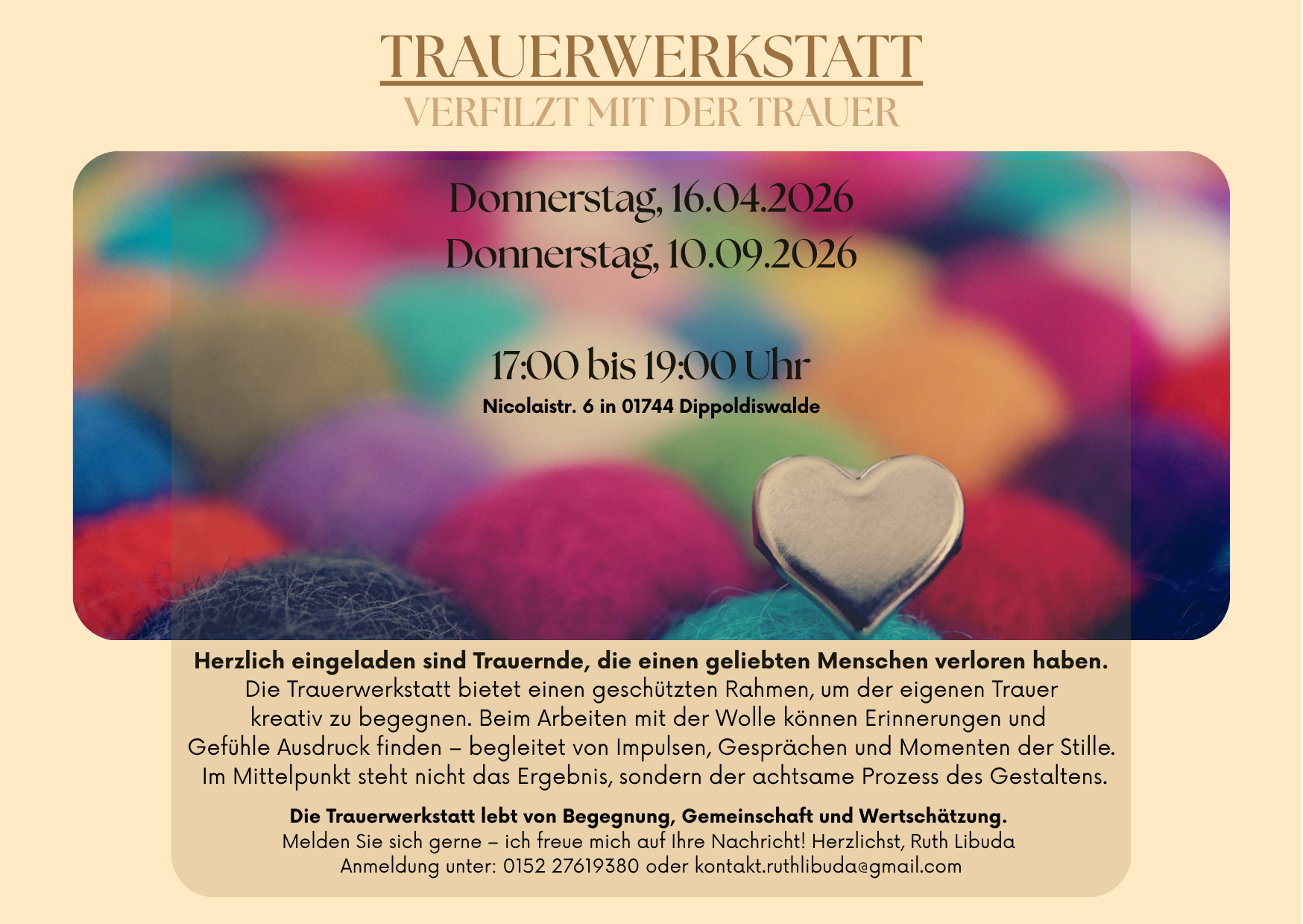 Anmeldung unter: 0152-27619380 oder kontakt.ruthlibuda@gmail.com